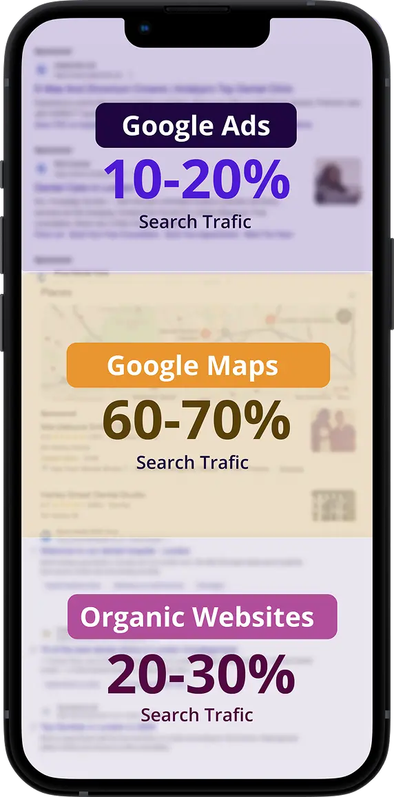 Top 3 Google Maps listings capture 60–70% of local search traffic, compared to 20–30% for organic websites, 5–10% for paid search ads, and 1–5% for Google Maps ads. Businesses in these positions get more clients, calls, and website visits—without the high costs of advertising.